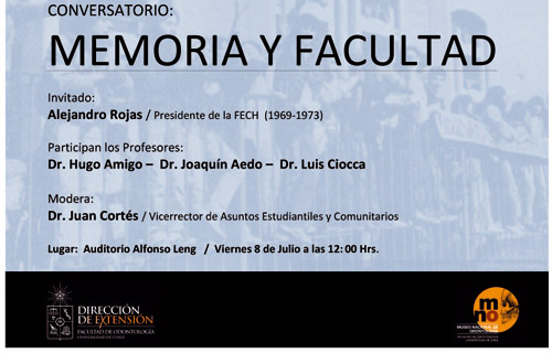 Con el Conversatorio Memoria y Facultad, organizado por la Vicerrectoría de Asuntos Estudiantiles y Comunitarios (VAEC) con la colaboración del Museo Nacional de Odontología (MNO) y la Dirección de Extensión de la Facultad de Odontología de la Universidad de Chile, la comunidad universitaria podrá dialogar con el ex Presidente de la Federación de Estudiantes de la Universidad de Chile (FECH), entre 1969 y 1973; y ex Alumno de la FOUCh.