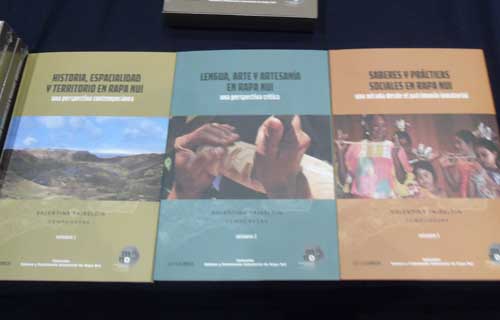 Conviene recordar que la Colección “Cultura y Patrimonio Inmaterial de Rapanui”, se compone de los libros Historia, Espacialidad y Territorio en Rapa Nui. Una perspectiva contemporánea; Lengua, Arte y Artesanía en Rapa Nui. Una perspectiva crítica; y Saberes y Prácticas Sociales en Rapa Nui. Una mirada desde el patrimonio inmaterial. Fue presentado en el Museo Antropológico P. Sebastián Englert en Rapa Nui; Centro de Extensión del Consejo Nacional de la Cultura y las Artes, en Valparaíso; y en la Casa Central de la Universidad de Chile.