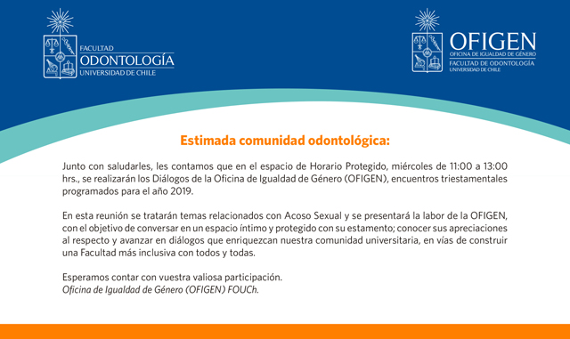 En el interés de promover encuentros triestamentales donde se aborden temáticas relacionados con Acoso Sexual y dar a conocer la labor de la Oficina de Igualdad de Género (OFIGEN) de la Facultad de Odontología de la Universidad de Chile, este miércoles 9 de enero comienzan los Diálogos-OFIGEN.