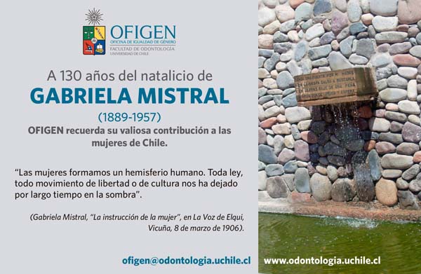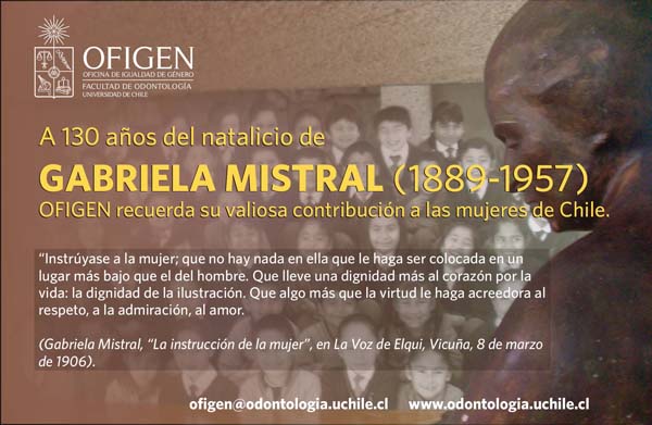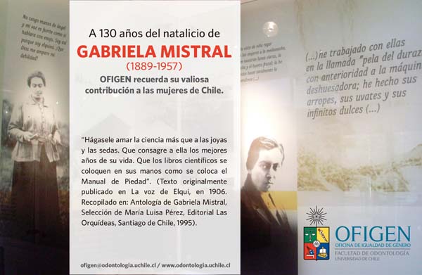 El domingo 7 de abril se conmemoró el natalicio de una de las mujeres más connotadas de las letras de nuestro país, Lucila Godoy Alcayaga o nuestra Gabriela Mistral, y la Oficina de Igualdad de Género (OFIGEN) de la Facultad de Odontología de la Universidad de Chile lo releva con una intervención gráfica y poética que destaca el aporte que la Premio Nobel (1945) al debate por la igualdad de género.