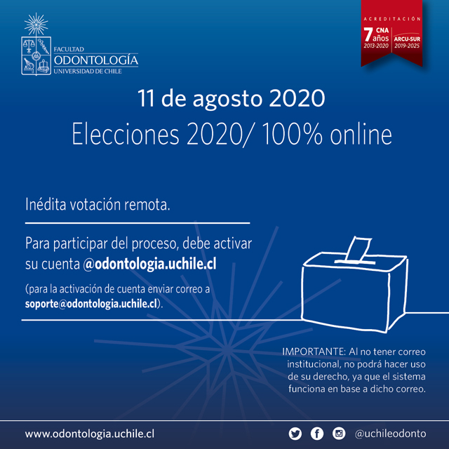 Por primera vez en la historia de la Facultad de Odontología de la Universidad de Chile, las elecciones de autoridades y representantes de académicos/as, se realizarán de forma 100% on line, con votación remota. Para participar del proceso, se debe activar la cuenta @odontologia.uchile.cl -para la activación de cuenta enviar correo a soporte@odontologia.uchile.cl