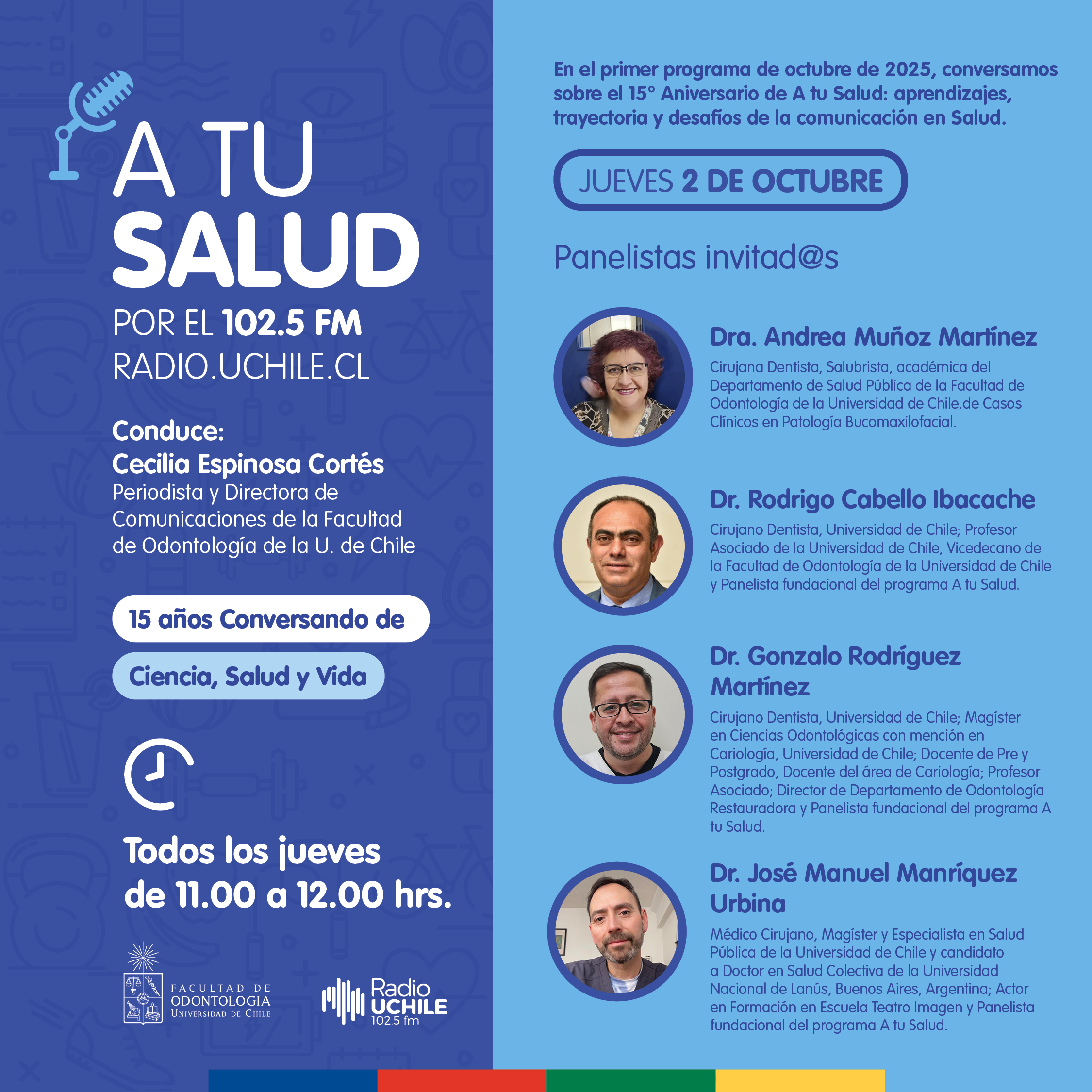 - Dr. Gonzalo Rodríguez Martínez, Cirujano Dentista, Universidad de Chile; Magíster en Ciencias Odontológicas con mención en Cariología, Universidad de Chile; Docente de Pre y Postgrado, Docente del área de Cariología; Profesor Asociado; Director de Departamento de Odontología Restauradora y Panelista fundacional del programa A tu Salud.