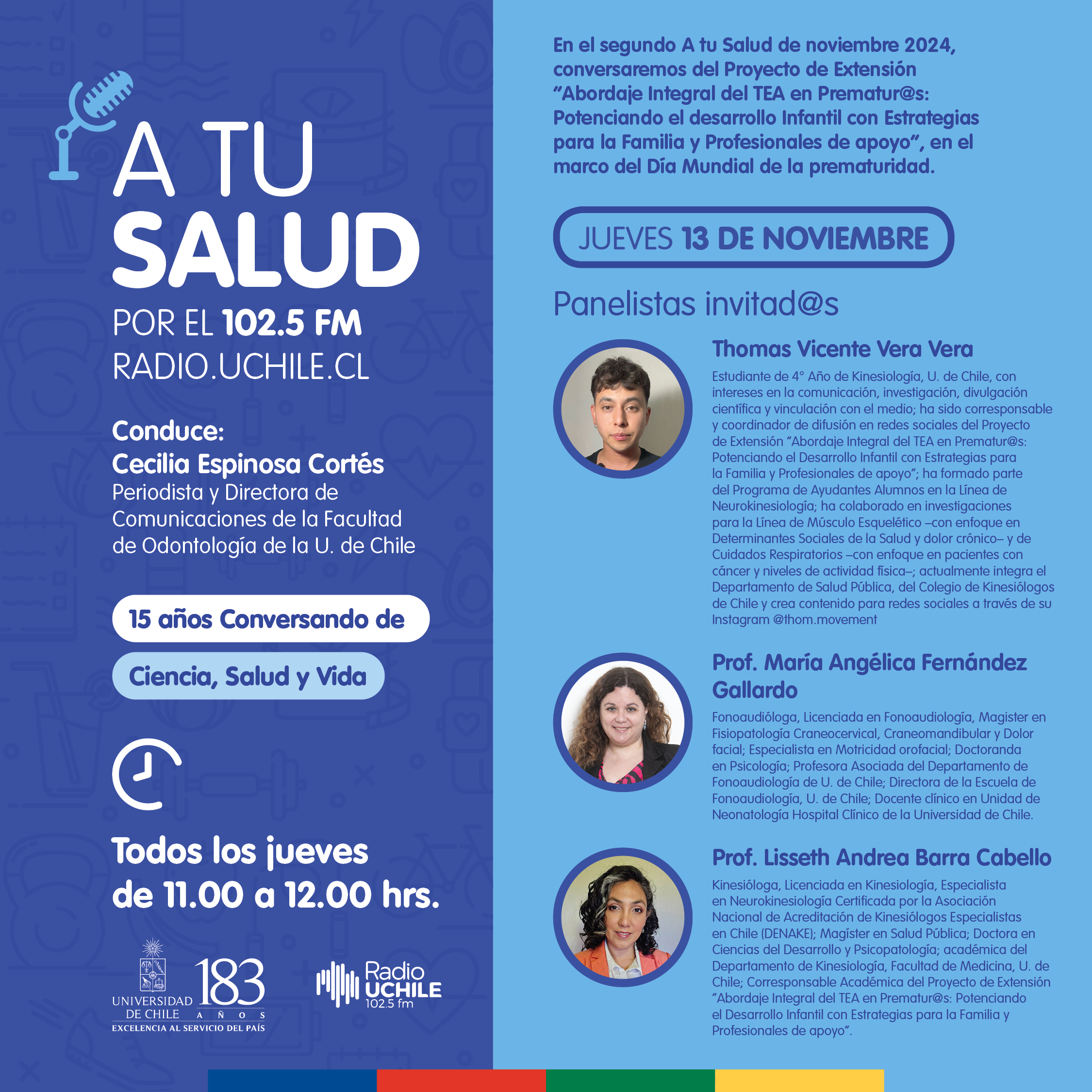 En el segundo A tu Salud de noviembre 2024, conversaremos del Proyecto de Extensión "Abordaje Integral del TEA en Prematur@s: Potenciando el desarrollo Infantil con Estrategias para la Familia y Profesionales de apoyo”, en el marco del Día Mundial de la prematuridad.