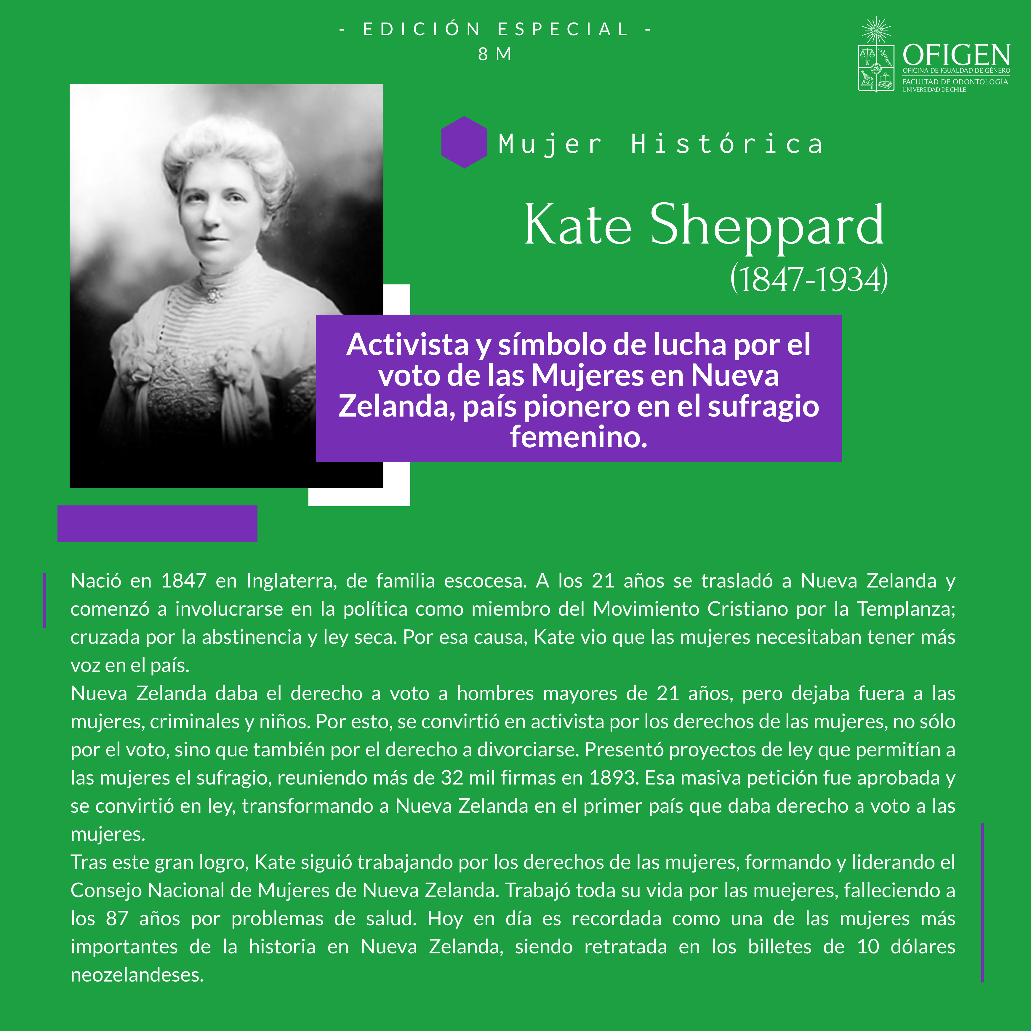 En este sentido, recalcó “nuestra campaña ‘Mujer Histórica’, llevada a cabo a través de nuestras redes sociales, ha ido posicionando el nombre de mujeres importantes en distintos ámbitos históricos, culturales y sociales; y, para la conmemoración del 8M de este año, nos centramos en destacar a dos mujeres sufragistas Emmeline Pankhurst y Kate Sheppard, ambas reconocidas por sus aportes en instalar el voto femenino en sus respectivos países. Esto porque este año nos enfrentamos, como país, a un hecho histórico en que nuestra participación está por primera vez garantizada en la generación de una nueva Constitución para Chile. Consideramos que es importante relevar cómo las mujeres hemos sido precursoras de avances en nuestros Derechos Políticos y Sociales, y de ahí establecer el nexo entre el movimiento sufragista y el impulso de la paridad de género en la Convención Constituyente”.