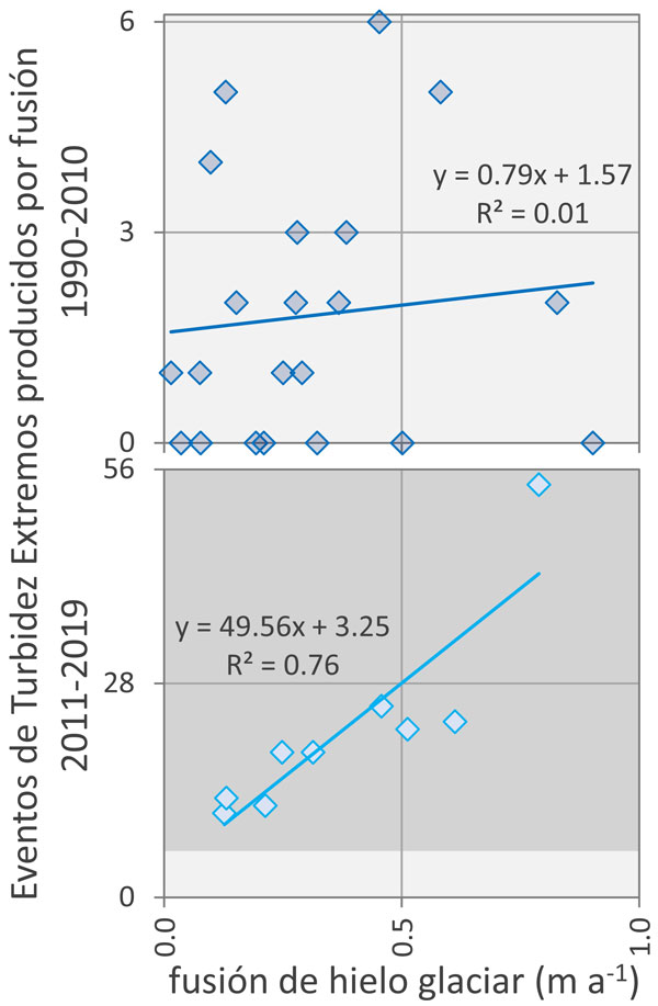A fin de intentar conocer los procesos geoclimáticos detrás de estos cambios, se procedió a comparar los ETE originados por deshielo con las series glaciológicas, hidrológicas y meteorológicas. Lo primero que resalta de este análisis es que los ETE no se asociaron ni a la lluvia ni a los caudales extremos. Sin embargo, sí tuvieron una correlación positiva con años de mayor derretimiento del hielo glaciar, en donde hay temperaturas por encima de la media y la cubierta de nieve invernal sobre los glaciares es escasa. Como lo ilustra la Figura 3, la dependencia del número de ETE con el deshielo glaciar se hizo más estrecha en la última década.
