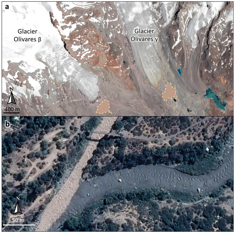 Durante las últimas décadas el aumento de la temperatura y las bajas precipitaciones han reducido la cobertura de nieve sobre los glaciares, por lo que el hielo glaciar ha estado expuesto por más tiempo a la atmósfera, la que, a su vez, es cada vez más cálida (Malmros et al. 2018). En base a estas observaciones, se hipotetiza que esta mayor exposición glaciar a la atmosfera provocó un incremento de la circulación de agua líquida y sus morfologías asociadas (molinos glaciares, canales supraglaciales y subglaciales), lo que eventualmente conectó piscinas de sedimento subglacial que antes no estaban disponibles (Figura 5). Si bien un reciente modelo físico de índole teórico sugirió que una pérdida sostenida de volumen glaciar podría conllevar un aumento dramático del caudal sólido fluvial de los glaciares “alpinos” o de “montaña” (Delaney & Adhikari 2020), esta sería la primera vez donde se constata con datos dicha teoría. Hipótesis alternativas fueron evaluadas por Vergara, Garreaud & Ayala (2022), pero descartadas al contrastarlas con las observaciones.
