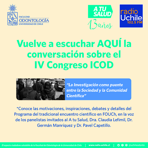 En el marco de la difusión del IV Congreso del Instituto de Investigación en Ciencias Odontológicas FOUCh, el Dr. Pavel Capetillo sostuvo que además “de la producción de conocimiento que hacemos en el Instituto, es importante la divulgación, el hecho de dar espacios para dar a conocer el desarrollo de las Ciencias que se hace en nuestra Facultad desde Pregrado, el Postgrado, que contamos con Programas de Magister y Doctorado, también ayuda a potenciar eso y a acercarnos a otras Instituciones y a la comunidad”.