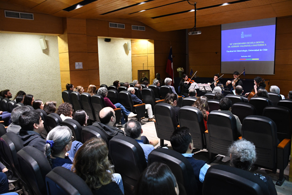 La comunidad odontológica presente en la ceremonia del 114° Aniversario Escuela Dental de la Universidad de Chile disfrutó de la intervención musical del Grupo Serendipia de la Facultad de la Casa de Bello, quienes interpretaron las piezas musicales Suite Bordemar de Jaime Barría, arreglo de Francisco Jara; y Gracias a la vida y La jardinera de Violeta Parra, arreglo de Jimmy Beas Olea.