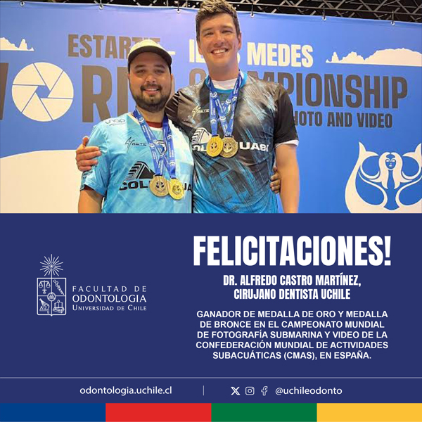 Campeón del Oro y Bronce en el Campeonato Mundial de Fotografía Submarina y Video de la Confederación Mundial de Actividades Subacuáticas (CMAS), en España, el Dr. Alfredo Castro Martínez, Cirujano Dentista UCHILE, copó los titulares de prensa deportiva en Chile y el mundo. Una aventura que comenzó con su pasión por la naturaleza y el mar y que se fue configurando desde el logro de la clasificación como representante nacional para el certamen en Cataluña, durante el pasado mes de julio y hoy se transforma en una inspiradora realidad.