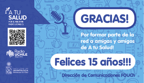 Confirmando su propósito como un espacio ciudadano saludable promotor de la divulgación científica en salud, de la Facultad de Odontología de la Universidad de Chile, en Radio Universidad de Chile, el programa A tu Salud celebró 15 años de transmisiones ininterrumpidas, en la 102.5 FM y radio.uchile.cl