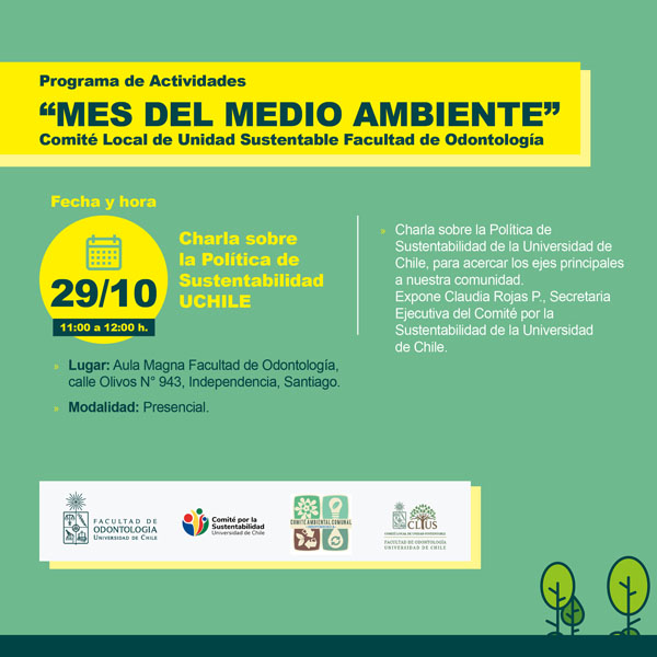 En el marco del Mes del Medio Ambiente de la Facultad de Odontología de la Universidad de Chile (FOUCh), el pasado 29 de octubre se realizó una charla dictada por Claudia Rojas, Secretaria Ejecutiva del Comité por la Sustentabilidad de la Universidad de Chile. La actividad se realizó en el Aula Magna Dr. Luis Ciocca Gómez y tuvo como objetivo “acercar los ejes principales de la sustentabilidad a la comunidad universitaria”, según indicó el Comité Local de Sustentabilidad (CLUS), como organizador de la actividad, que estuvo encabezada por la Decana de la Facultad de Odontología, Prof. Dra. Irene Morales Bozo.