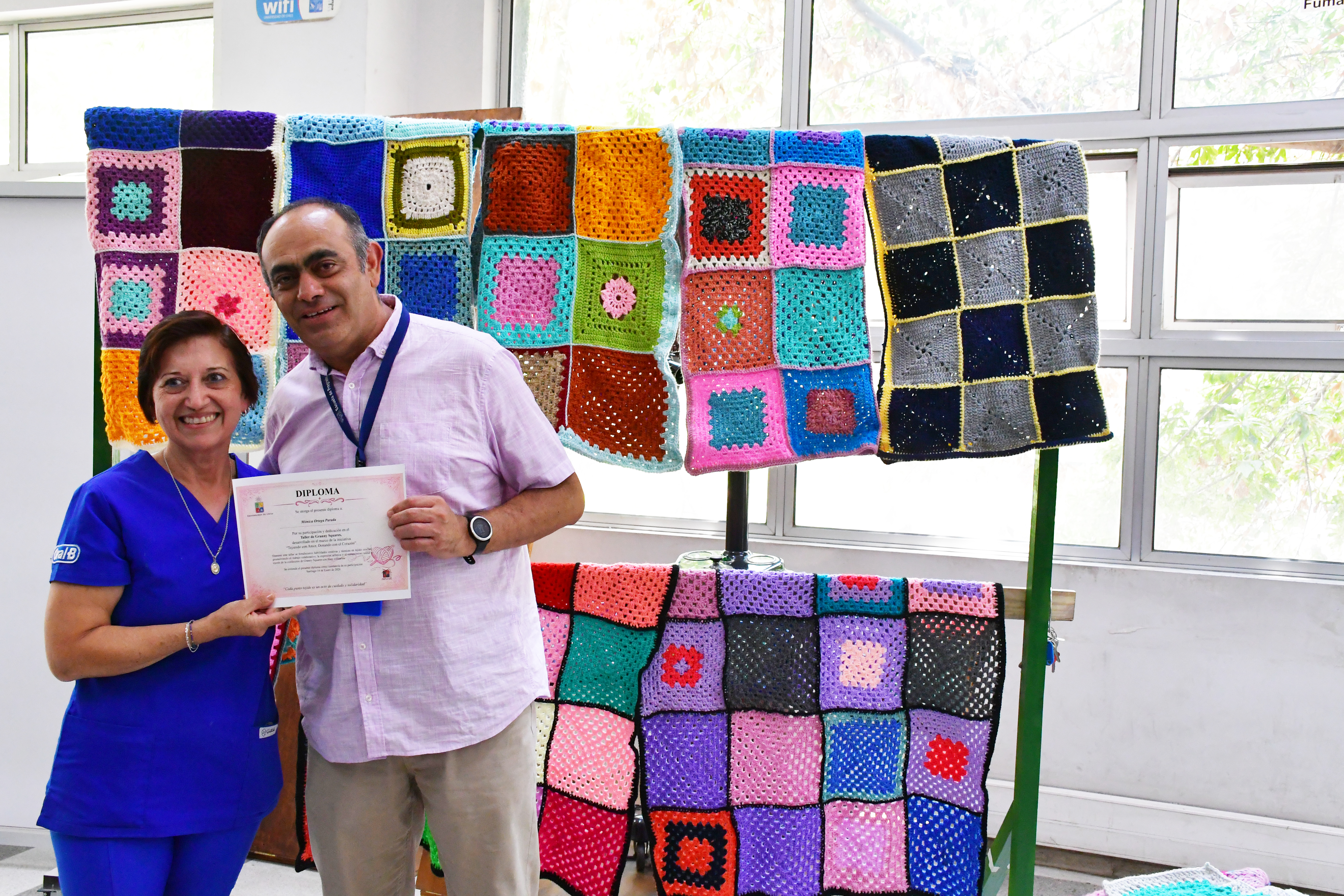 El Proyecto Taller de Granny Squares “Tejiendo con amor, donando con el corazón" se ejecutó desde el martes 7 de octubre de 2025, en Horario Protegido -12.00 a 13.00 horas-, en la Facultad de Odontología de la U. de Chile.