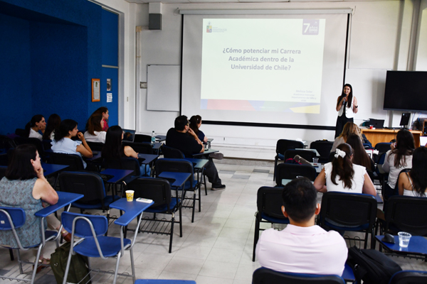 Durante la sesión de tarde, la Dra. Melissa Solar abordó la relevancia de la progresión docente bajo el título "¿Cómo potenciar mi carrera Académica dentro de la Universidad de Chile?", brindando herramientas clave para el crecimiento institucional.